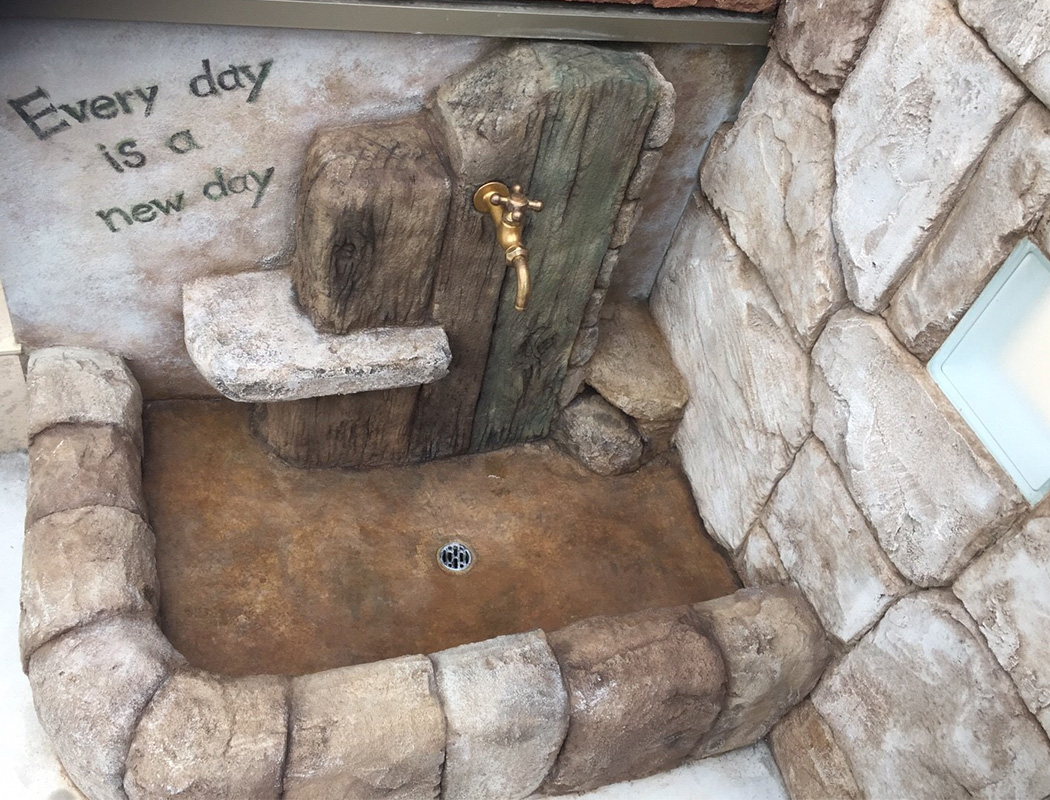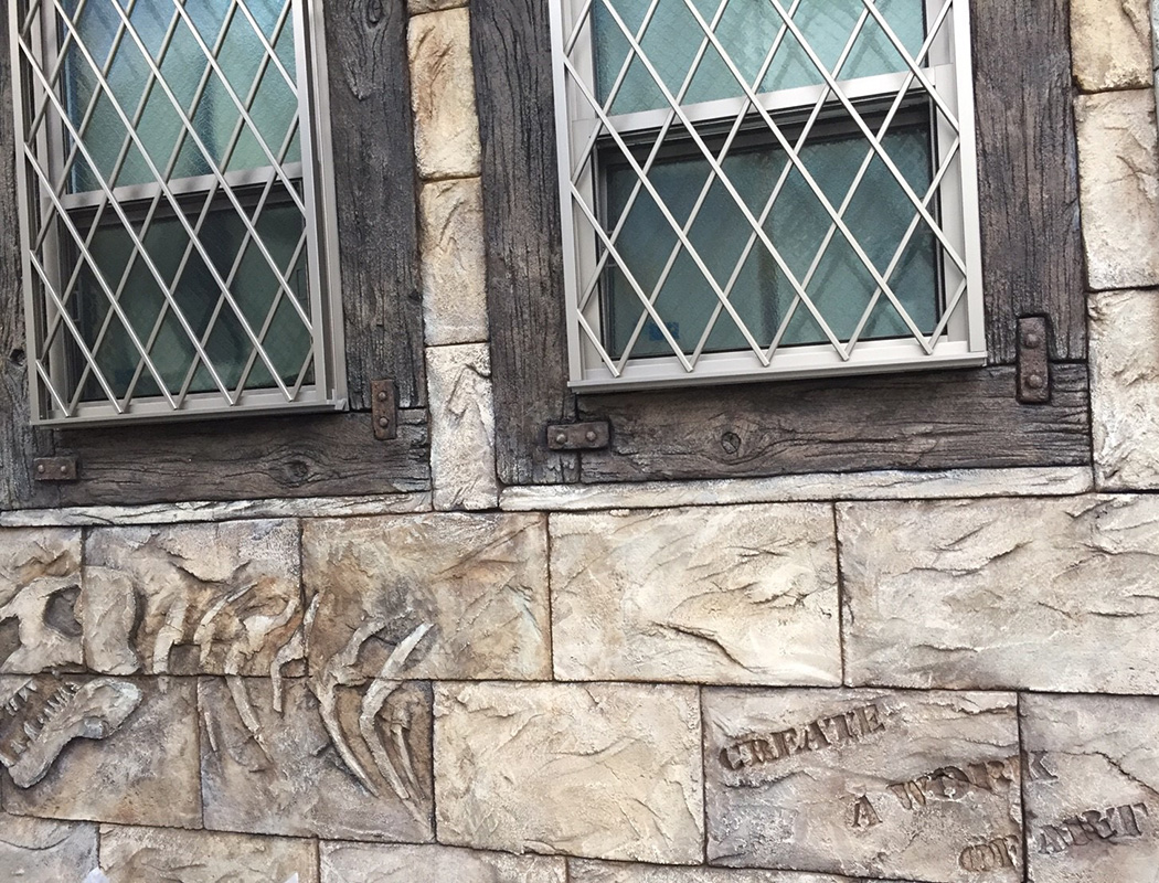 大型テーマパークやショッピングモールで見るヨーロッパ風の街並み、レンガ造りの建物や本格的な石積みの塀などは本物ではなくコンクリートで擬岩や擬木などを彫刻、塗装してリアルに再現したものです。